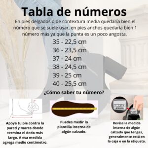 • HORMA:La punta es angosta. El número 35 y 36 es horma normal, desde el 37 al 40 es pequeña, si estás entre 2 números se recomienda llevar el más grande.