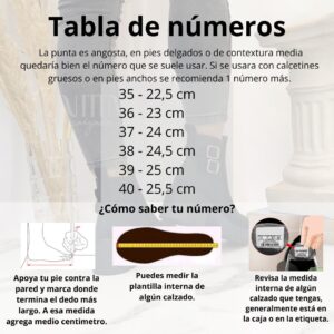 • HORMA: La punta es angosta, en pies delgados o de contextura media quedaría bien el número que se suele usar. Si se usara con calcetines gruesos o en pies anchos se recomienda 1 número más.