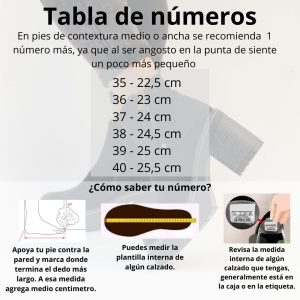 • En pies anchos o de contextura media quedaría mejor 1 número más, ya que es angosto, lo cual hace que se sientan más pequeños.