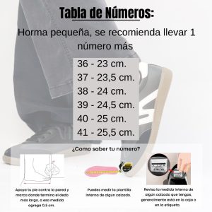 • Horma pequeña, se recomienda llevar 1 número mas del que se suele usar.